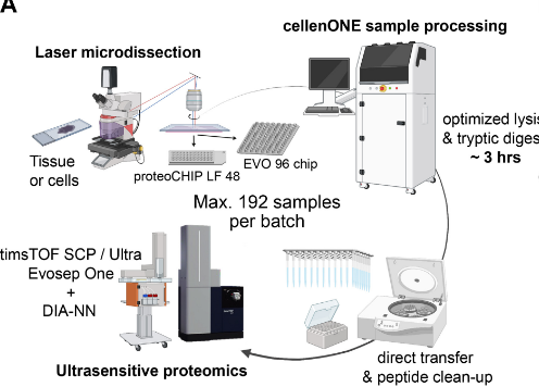 This study by Prof Fabian Coscia’s group at Max-Delbrück Center (Berlin, GE) presents an automated workflow linking laser microdissection with the cellenONE instrument for ultrasensitive spatial proteomics. Processing up to 192 samples in 3–4 hours on proteoCHIP LF 48 or EVO 96, the protocol minimizes loss, streamlines preparation, and delivers deep proteome coverage (~2,000 proteins) from defined tissue microregions, enabling high-specificity phenotyping in clinical and archival samples.
