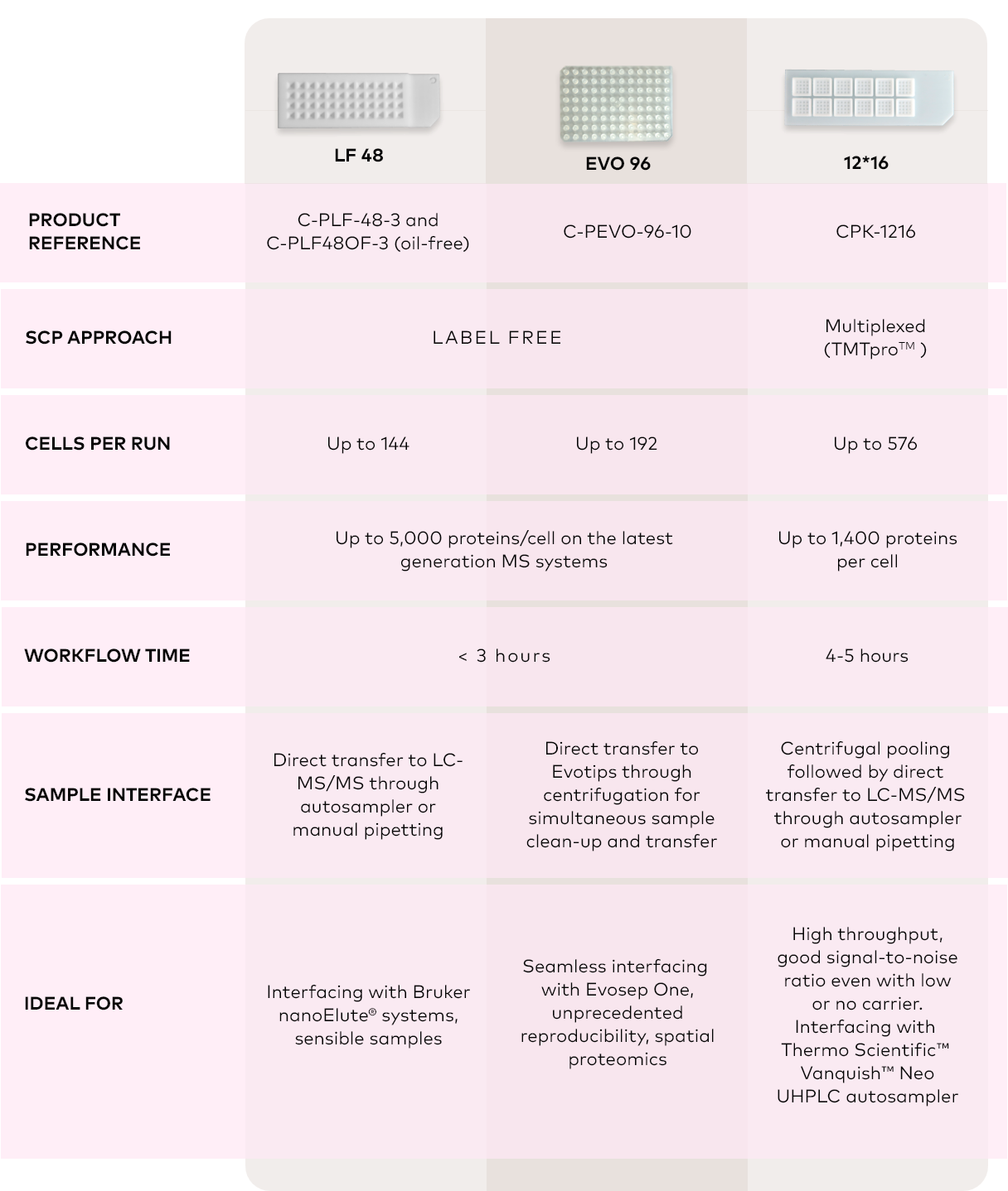 All support parallel processing: LF48 handles 48 wells x3 chips (144 cells), 12*16 handles up to 576 cells, and EVO 96 processes 192 samples per run.